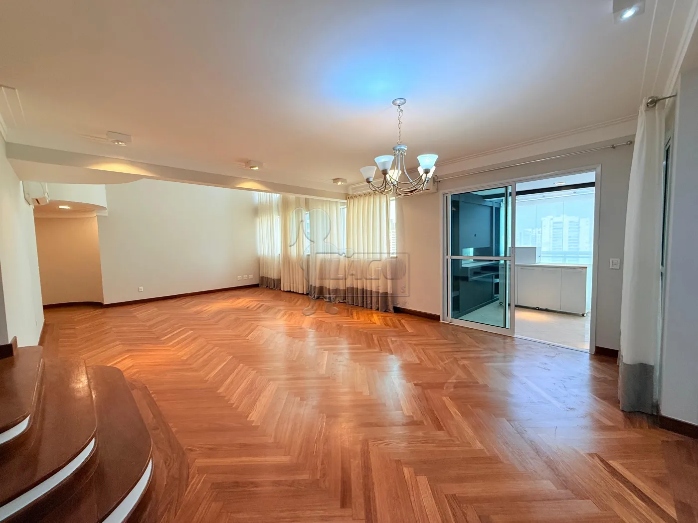 -Sala de 03 ambientes com cortinas, lustres e pé direito alto;
