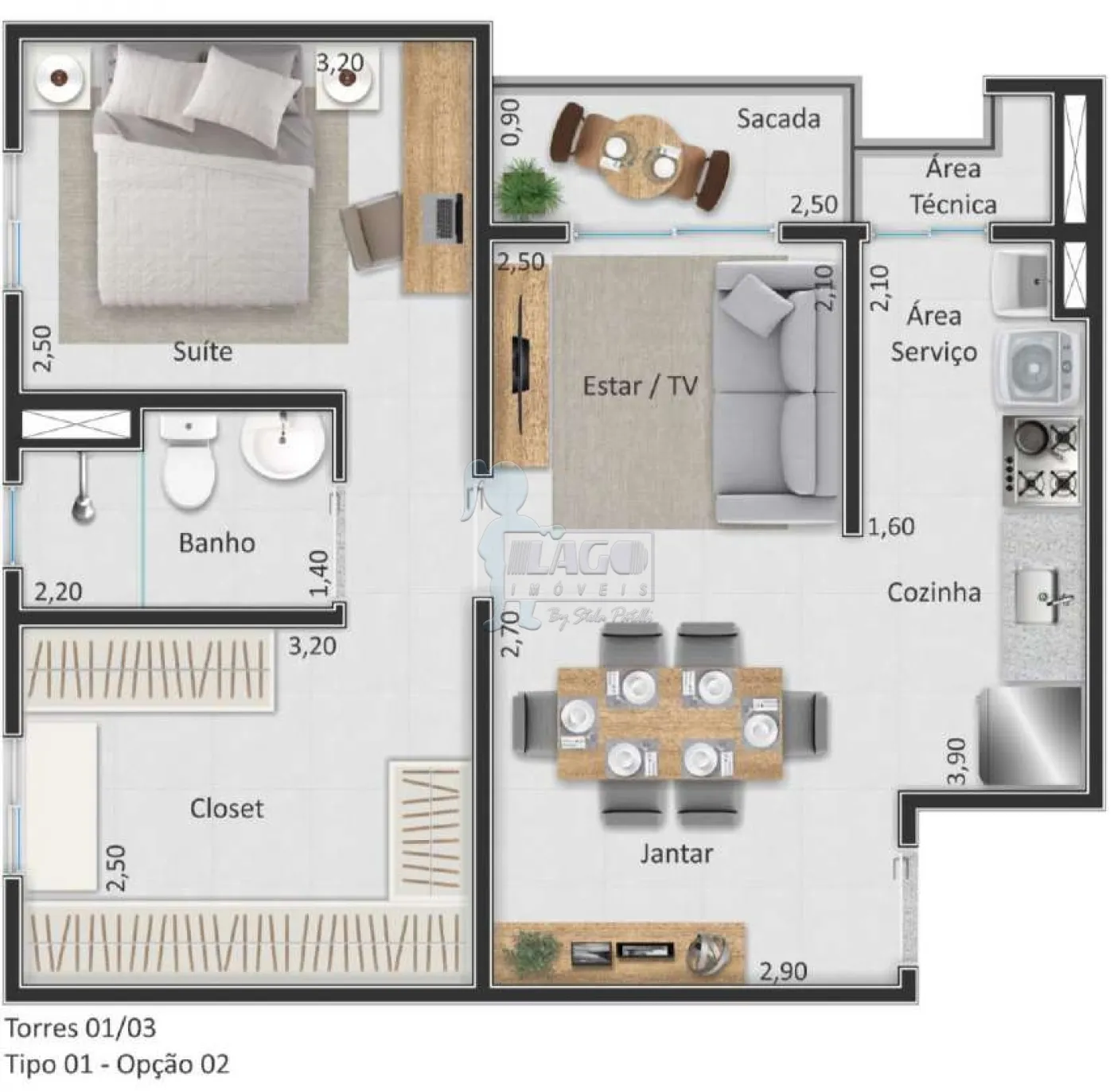 Apartamentos com finais 2, 3, 6 e 7 com 2 dormitórios, sala para 2 ambientes, banheiro social, cozinha americana, sacada, área técnica e 1 vaga de garagem.