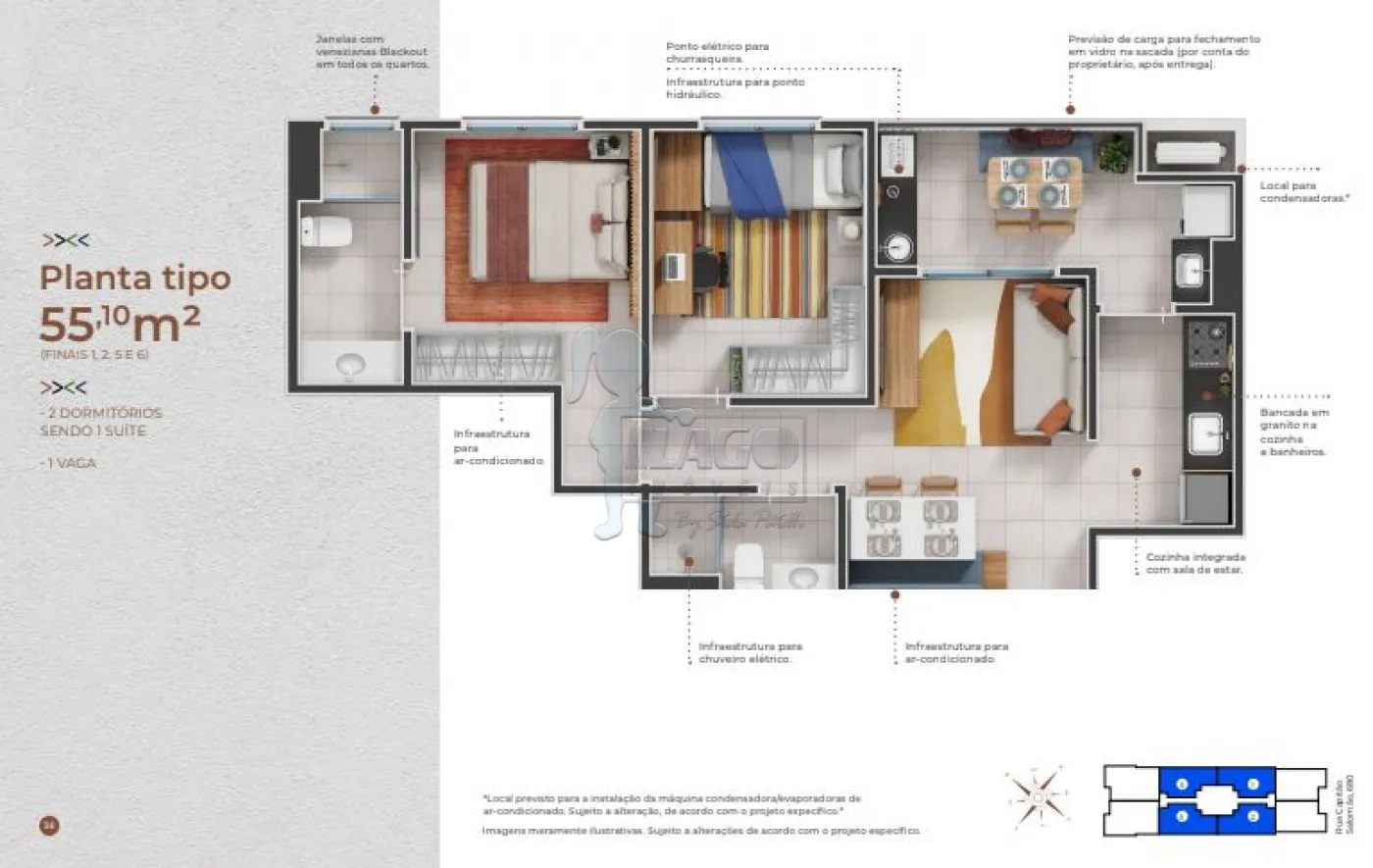 Apartamentos de 55m² (finais 1, 2, 5 e 6) com: