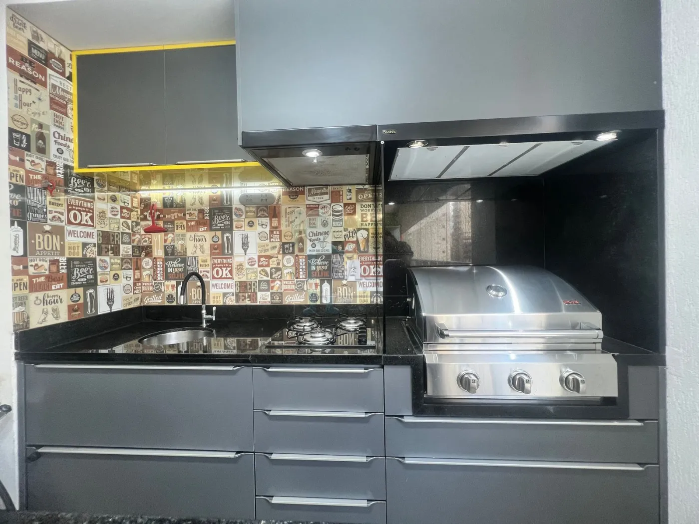 -Sacada gourmet ampla com churrasqueira e ilha com armários;