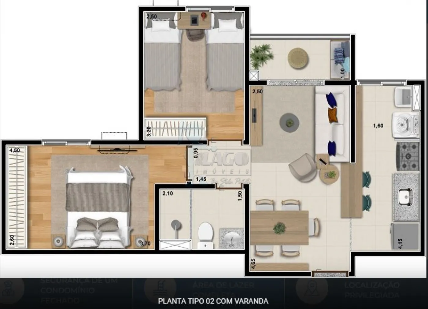 Sala com sacada, 2 dormitórios ,banheiro social, cozinha americana, área de serviço, 1 vaga de garagem descoberta.