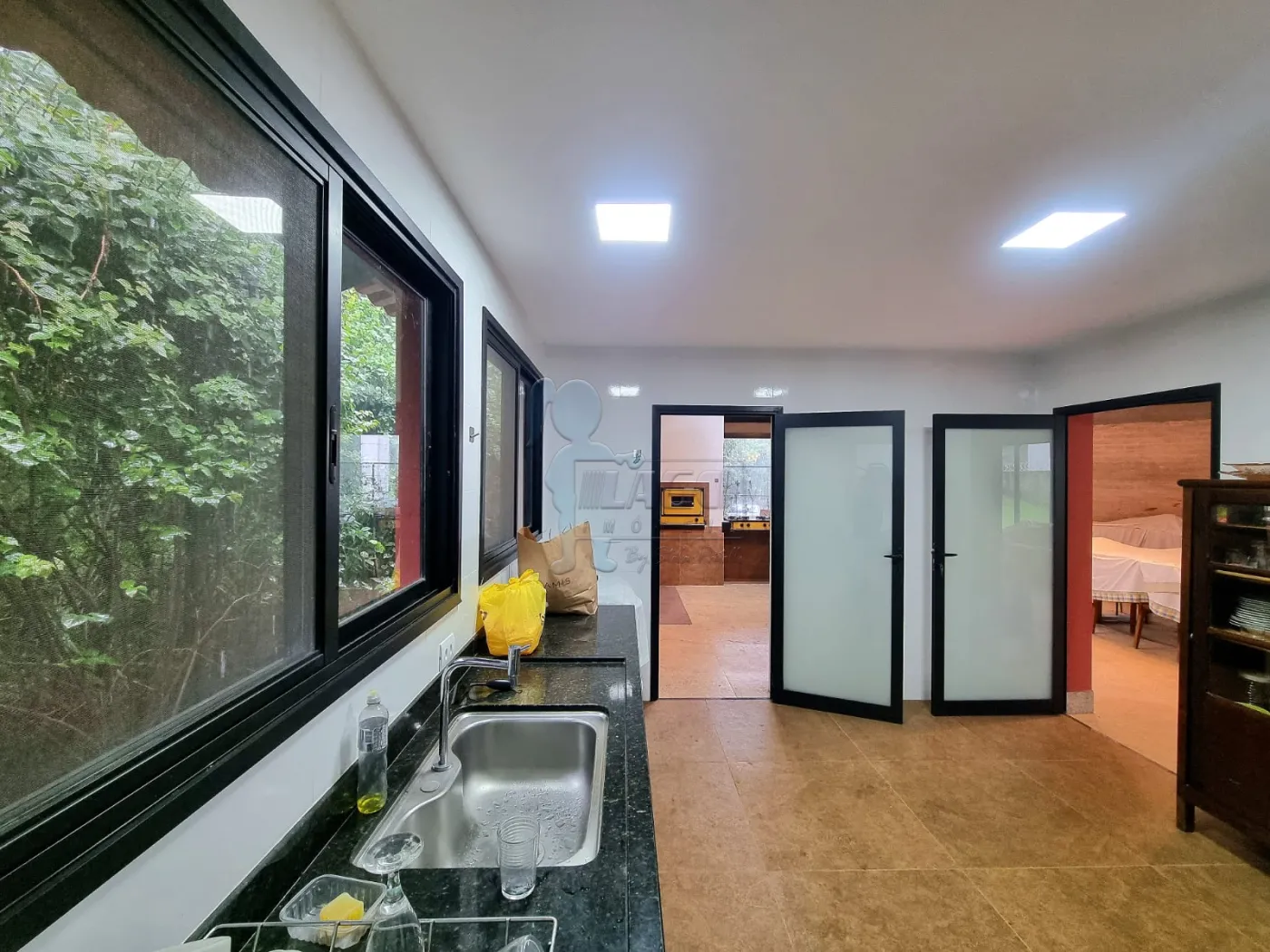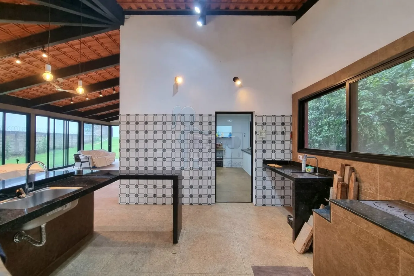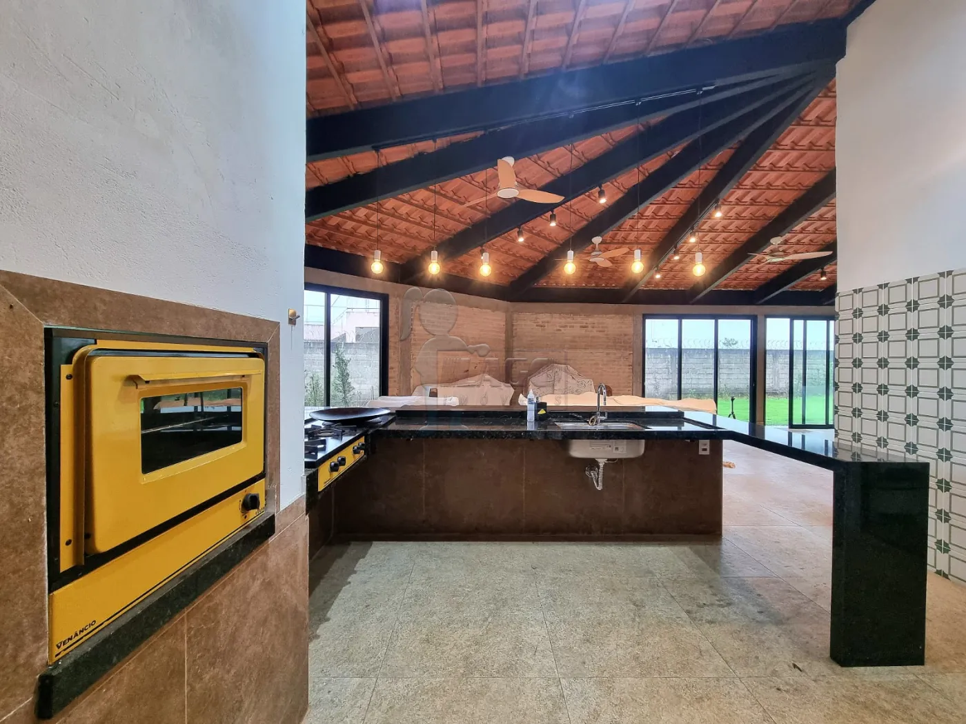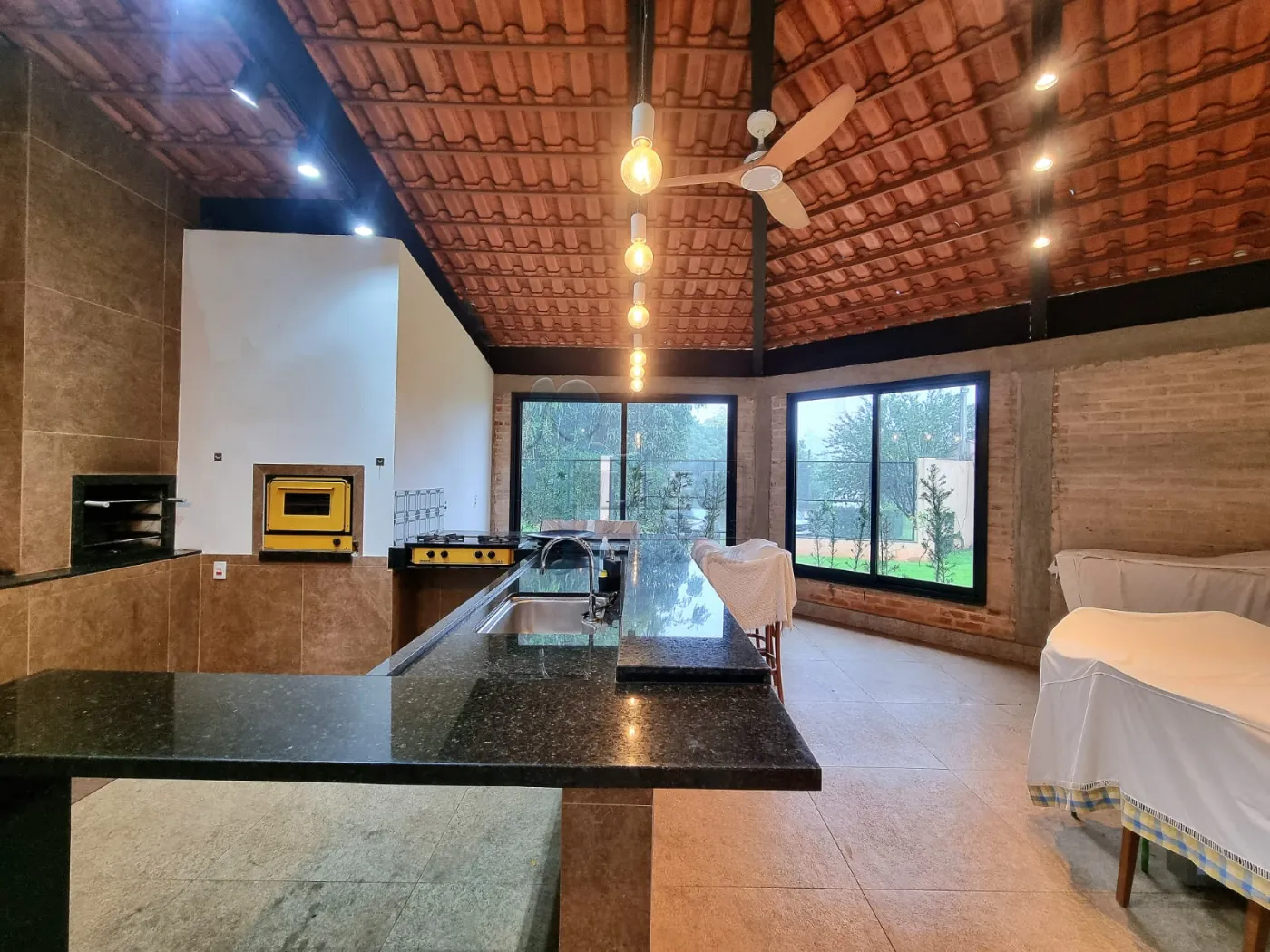 -Área gourmet com bancada em granito, pia em aço inox com duas cubas e revestimento em vidro temperado;
