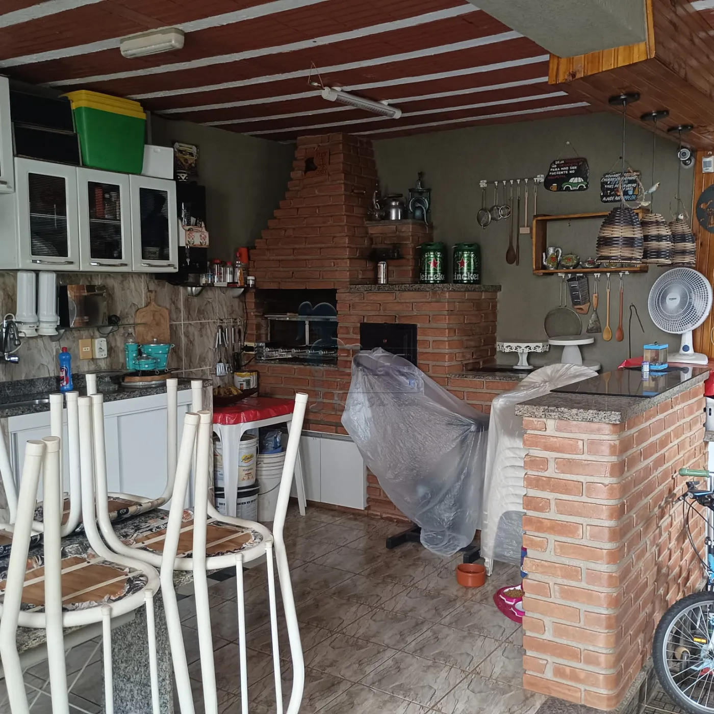Casa terrea com 2 quartos, 2 banheiros sem 1 com uma hidromassagem, sala ampla, cozinha com armarios planejados e balcão de pedra, area de churrasco com fogao a lenha e forno, 1 quartinho para guardar utensilios, coredor dos dois lçados da casa.