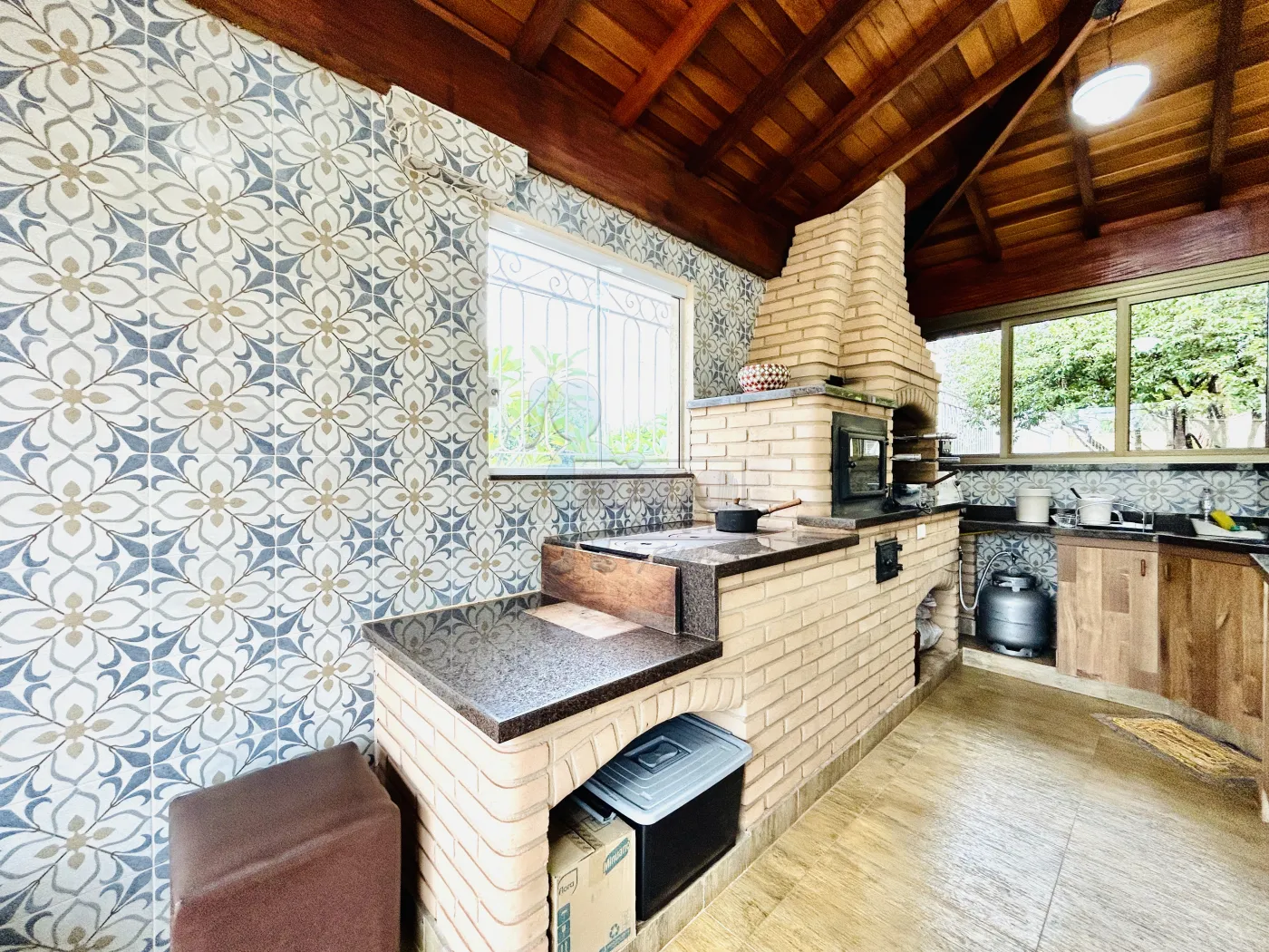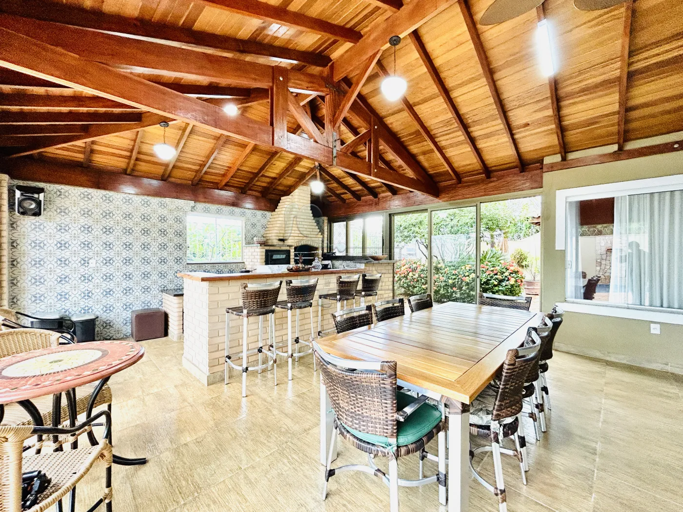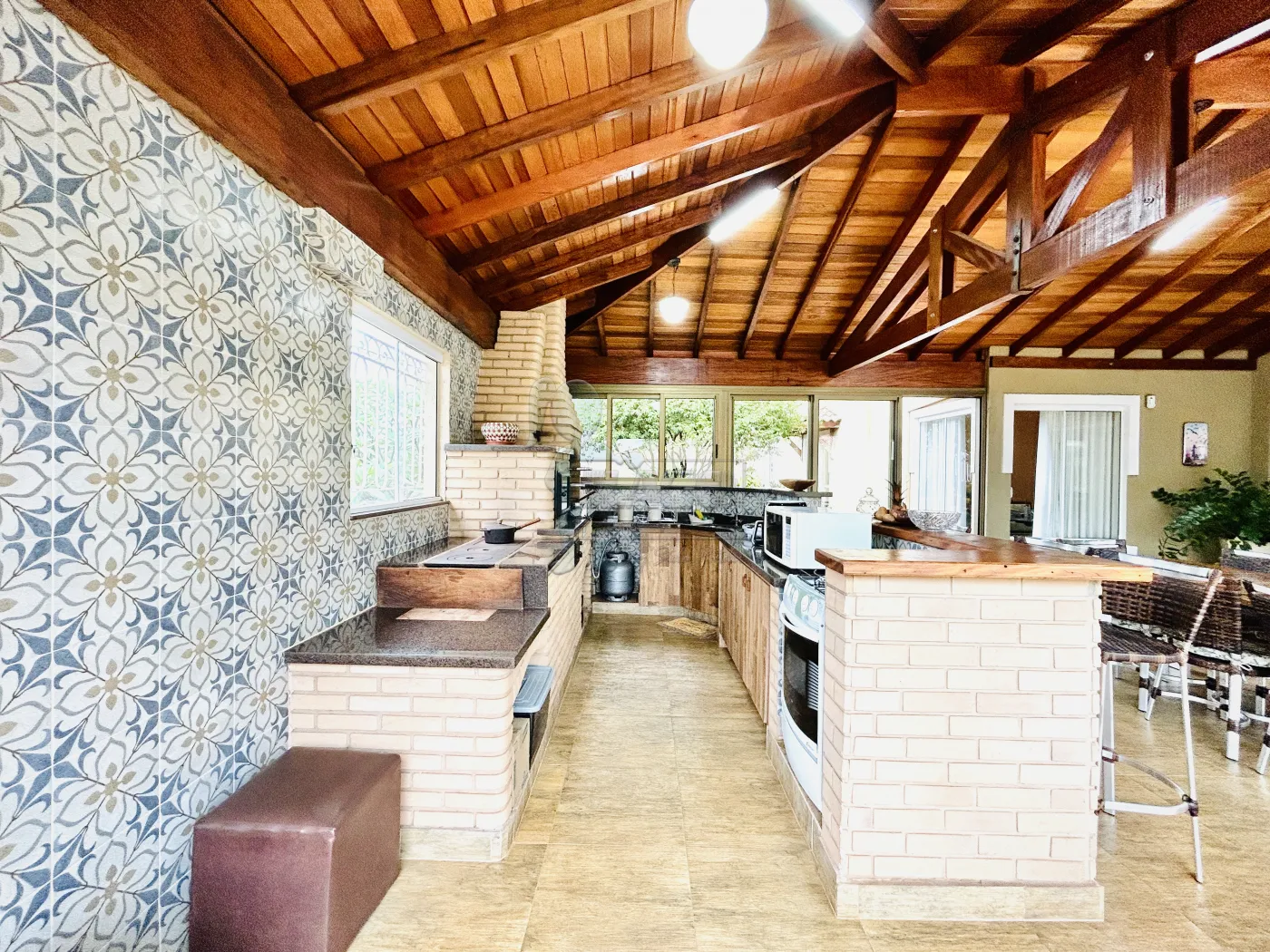 -Varanda gourmet com churrasqueira, forno, fogão a lenha e fechamento em vidros;